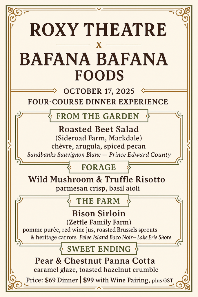 The Roxy Theatre/OSLT is excited to be collaborating with Chef David Green Thompson and Bafana Bafana Foods to offer these exclusive dining experiences!